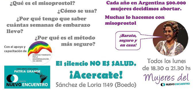 ¿Es seguro el aborto con pastillas? ¿Por qué? ¿Qué es el misoprostol? ¿Cómo se usa? ¿Tengo que hacerme una ecografía? Las preguntas tendrán respuestas en el local de Nuevo Encuentro de Boedo (Sánchez de Loria 1149), cada lunes desde las 18.30 hasta las 21.30. “Dar información de manera libre, correcta, responsable es una posición política, y nosotras la transmitimos rompiendo con la invisibilización. Abordamos el tema de la interrupción voluntaria del embarazo rompiendo con los tabúes, desdramatizando”, dice Emelina, y enseguida refiere al volante con el cual difundieron la consejería: con la imagen de Doña Florinda y La Chilindrina -dos personajes de la comunidad del Chavo del 8- invitaron e invitan desde hace dos semanas a acercarse con dudas para llevarse datos certeros. Allí, la madre de Quico sonríe y enumera tres factores que hacen del misoprostol un aliado en tiempos en donde la despenalización y legalización del aborto se cajonea por razones que le escapan a los razonamientos: es seguro, barato y permite que las mujeres puedan realizar la práctica en sus casas.